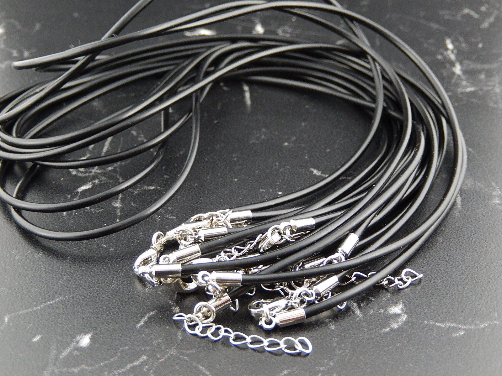 jolie collier en cordon cuir noir avec fermoir griffe mousqueton et chainette d’extension en métal.