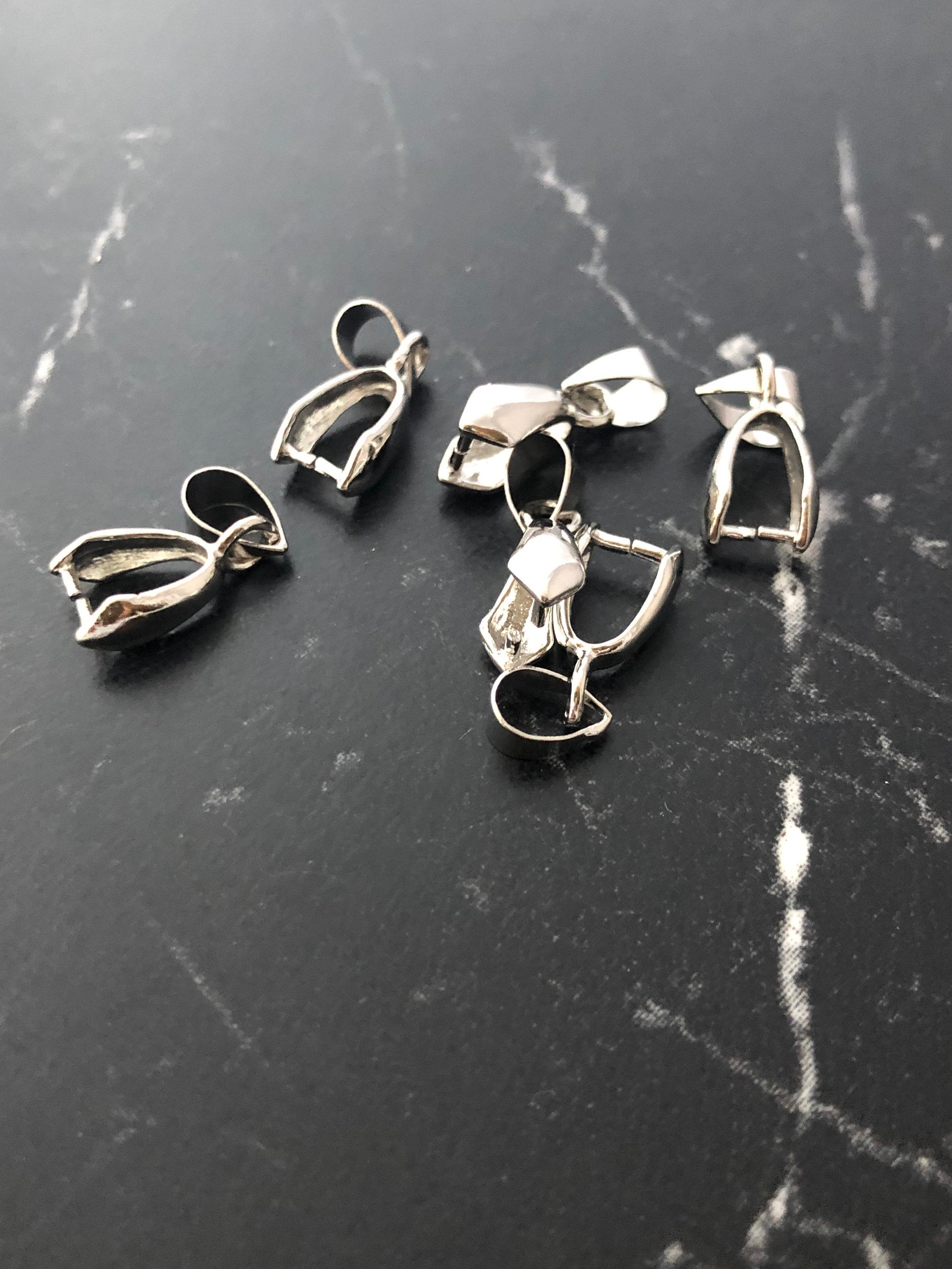 10 Bélière porte pendentif métal argenté taille 15mm de long sur 8mm broches 0,8 mm pour un passage de fil 0,3 mm.