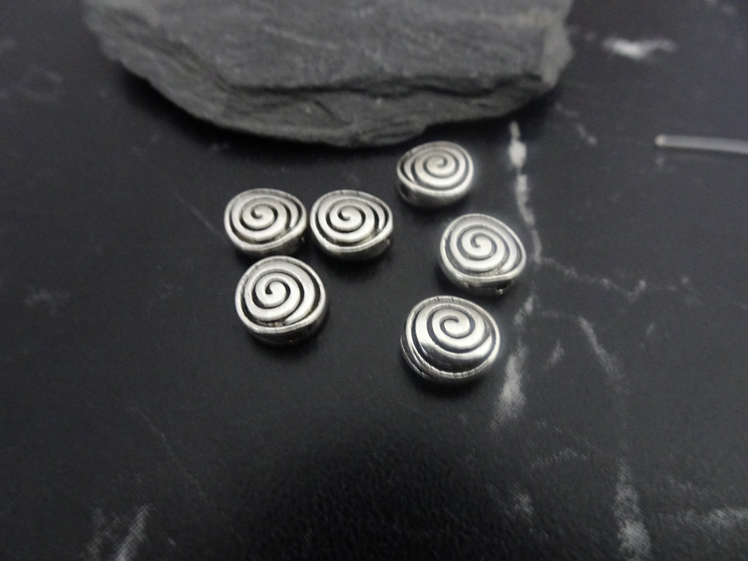 10 perles intercalaire rond plat sculpté , couleur argent antique environ 8X4 mm de diamètre ,trou, 1,5mm.