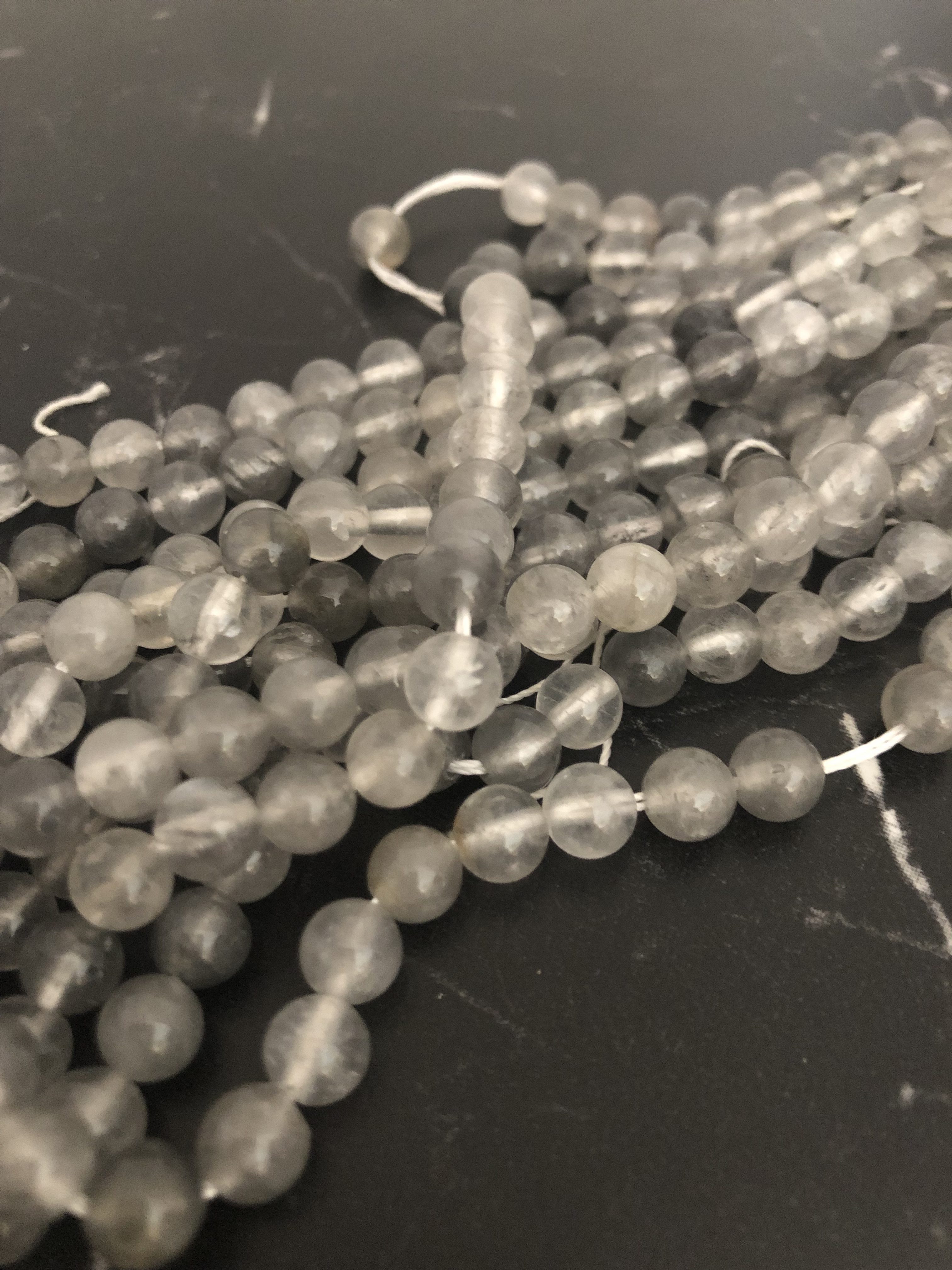 Les perles grises (plus ou moins clair selon les pierres) avec de jolies inclusions qui ressemblent à des nuages…