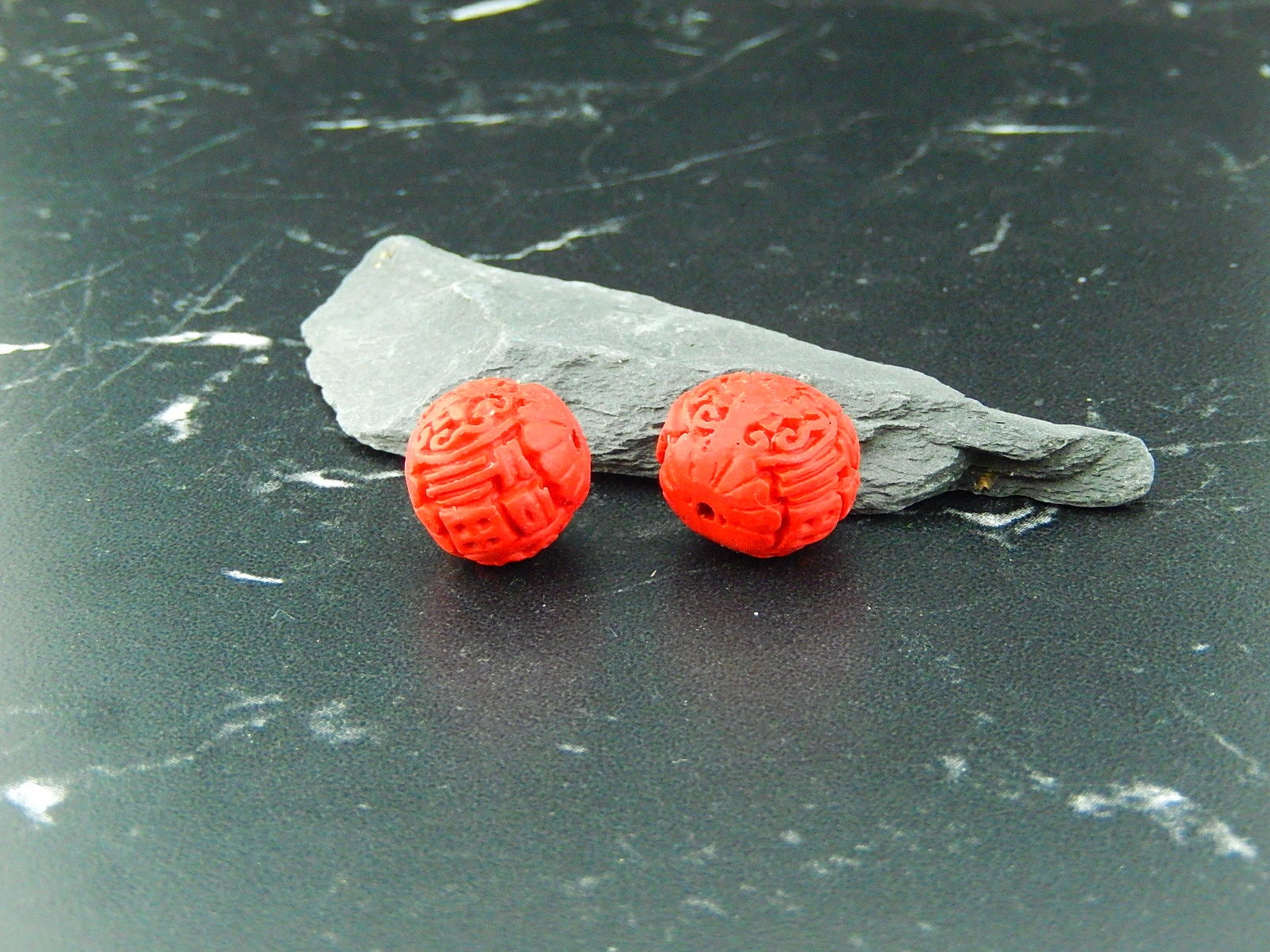 perle cinabre ronde lot de 5, rouge avec une gravure ,taille 10 mm de diamètre