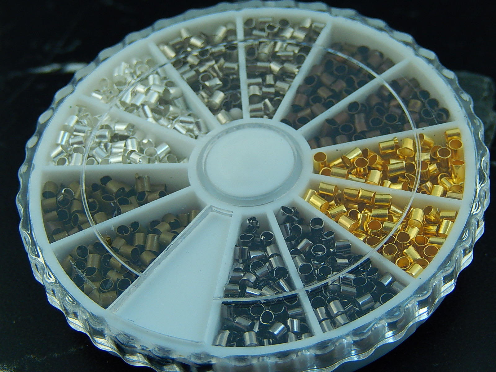 6 coloris de perles à écraser: argent clair, argent foncé, bronze, or/doré, noir, cuivre