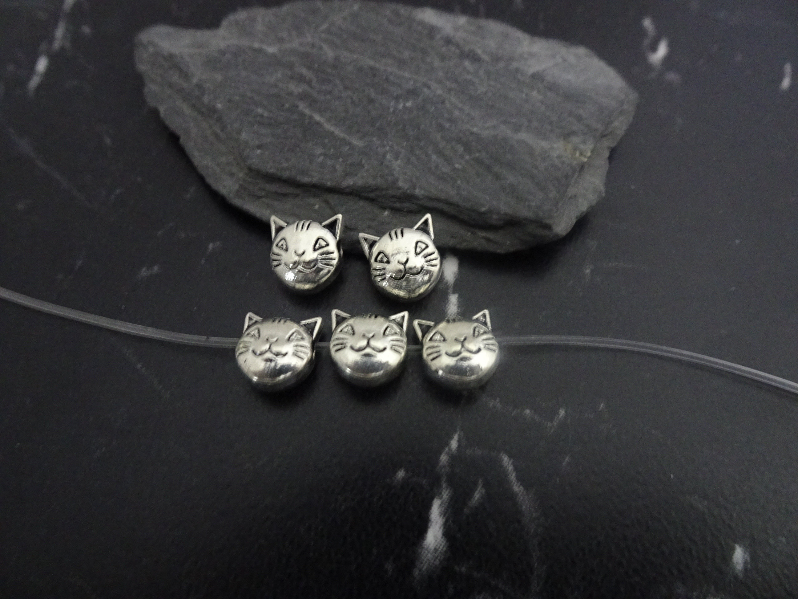 Perles tête de chat lot de 5 perles ,en alliage style tibétain argent antique